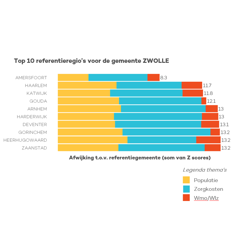 De selectie van referentieregio’s laat zien dat de gemeente Zwolle op populatiekenmerken, zorgkosten én zorguitgaven in de Wmo en Wlz het meest vergelijkbaar is met de gemeente Amersfoort. Dit berekenen we op basis van de som van de totale afwijking op deze kenmerken ten opzichte van de referentieregio (de zogenaamde Z-score). Hoe minder afwijking, hoe lager de Z-score, en hoe meer de regio’s met elkaar vergelijkbaar zijn.