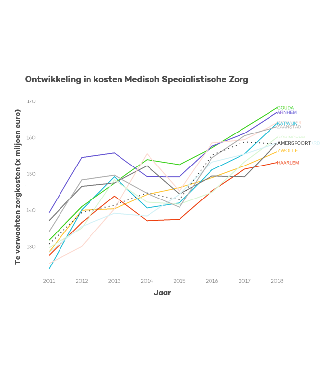 In de afbeelding hiernaast is te zien dat bij de gemeente Zwolle (de gele lijn) de kosten sinds 2011. Deze trend zien we echter voor bijna alle referentiegemeenten terug. Vergeleken met de gemeente Amersfoort (de gestippelde zwarte lijn) zien we een duidelijk verschil: waar de kosten MSZ in 2011 tot en met 2014 nog goed vergelijkbaar waren tussen beide gemeenten, namen de kosten in de gemeente Amersfoort in 2015 enigszins af. Vervolgens zien we echter een sterke verhoging van de MSZ kosten in de gemeente Amersfoort, waar deze in Zwolle stabieler blijven toenemen.
